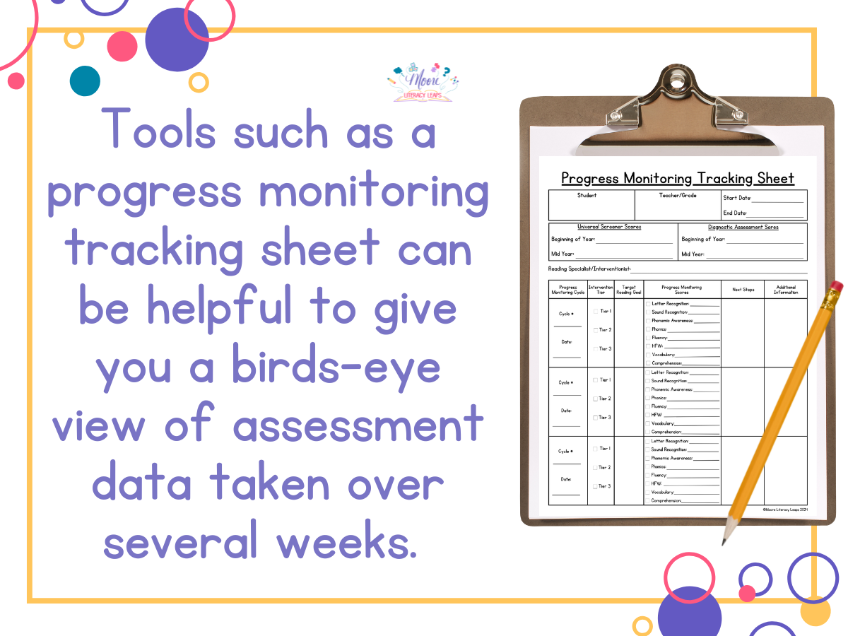 Tools such as a progress monitoring tracking sheet can be helpful to give you a birds-eye view of assessment data taken over several weeks.